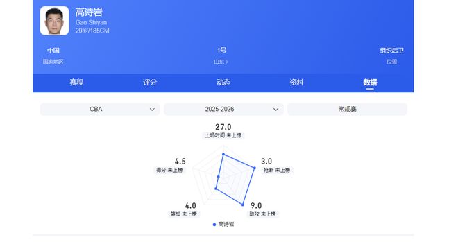 至于高诗岩,两轮过后,他的场均数据是4.5分9助攻3抢断,投篮命中率25%,三分命中率16.7%。该表现直观体现出了他缺乏攻框、投篮能力,但防守积极的特点。